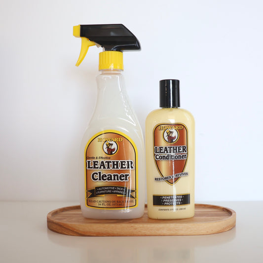 - For leather: Howard Leather Cleaner (to clean) and Howard Leather Conditioner (to moisturize & protect). We offer both these leather care products in a bundle.