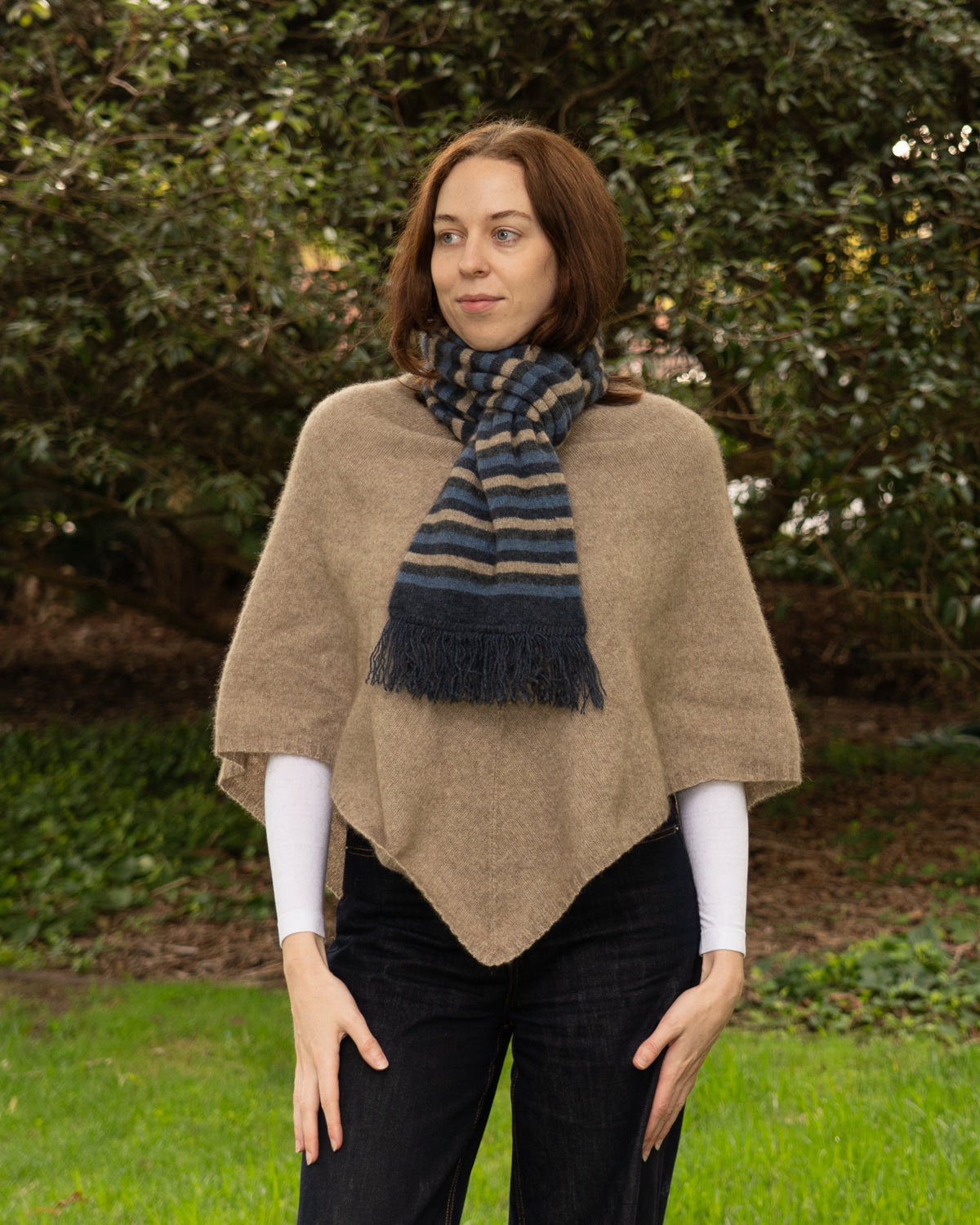 This Stripe possum merino scarf features double thickness and fringing.
