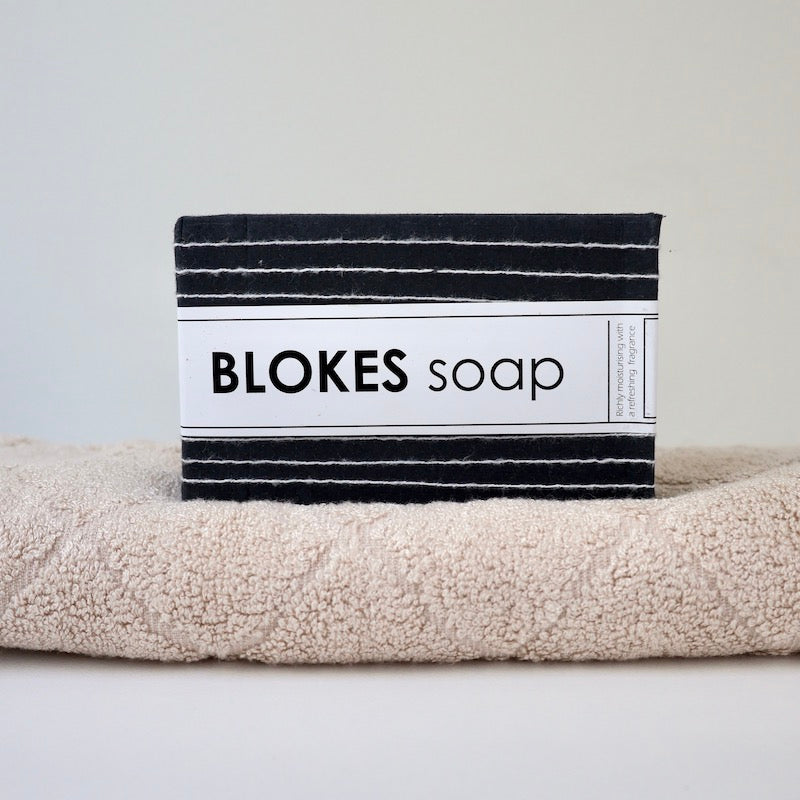 A generous cake of handmade soap containing a mix of essential oils of, anise, cinnamon and citrus - a potent and stimulating blend. Black paper packaging with white stitching.