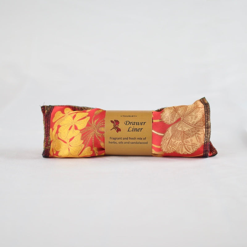 Sewn in a silky smooth satin fabric, place these beautiful liners in your drawers to freshen your clothing with a beautiful scent and repel insects. Size is 25 x 21 cm wide x 2 cm thick herbal filled silk pad.