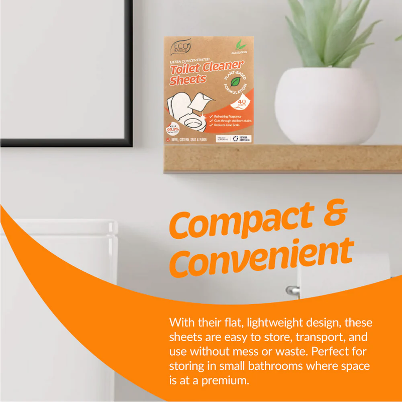 Change the way you clean your toilet with Eco Basics Ultra Concentrated Toilet Cleaning Sheets. Powered by advanced plant-based cleaning technology, each sheet is designed to dissolve tough stains, reduce lime scale, and leave behind a fresh eucalyptus scent. It’s a simple, sustainable solution for total toilet hygiene.