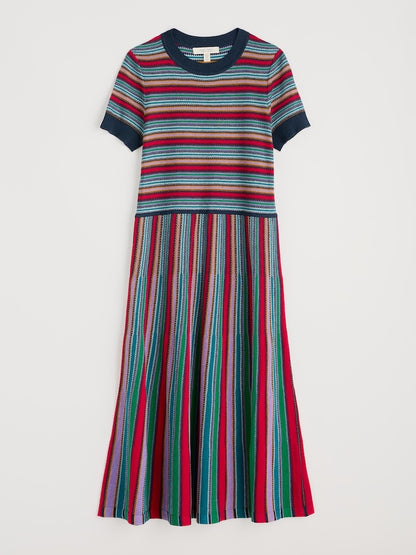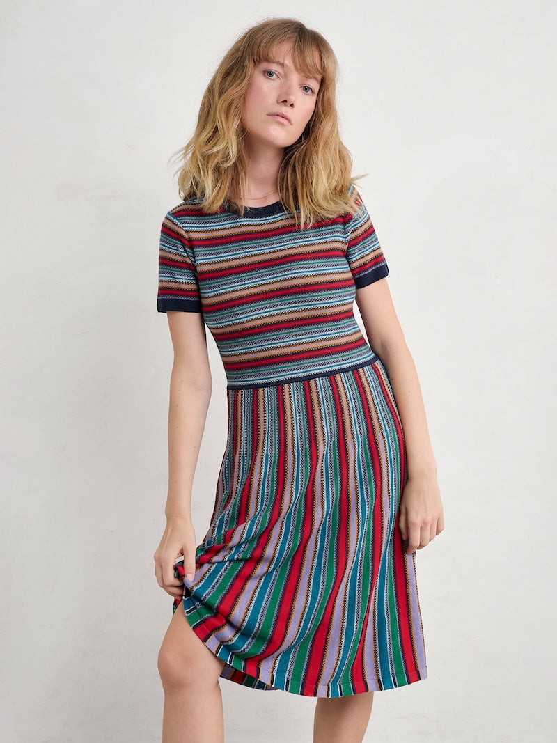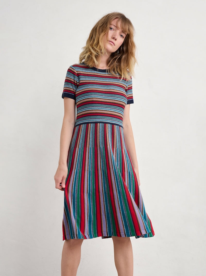 A lightweight fit-and-flare midi dress with colourful yarn-dyed stripes. It's knitted from GOTS-certified organic cotton for cool and comfortable summertime wear. The textured stitching brings depth and character to the vivid coastal colours, while the contrasting stripe direction on the skirt creates a striking detail. The styling is kept simple with a trimmed round neck and short sleeves, letting those beautiful stripes speak for themselves.